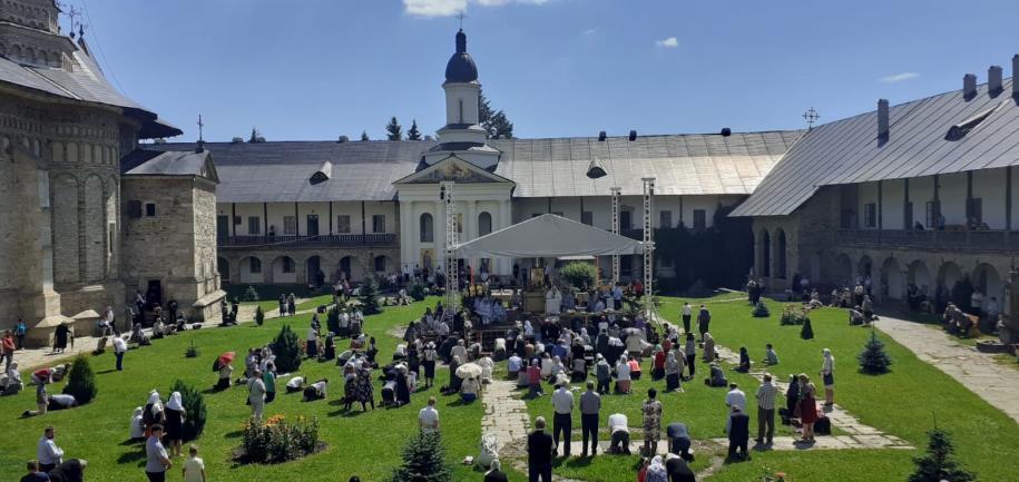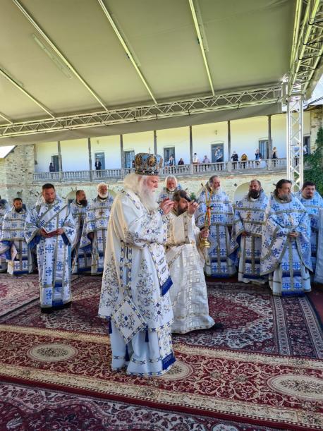 În ziua hramului, la revărsatul zorilor, cerul, luminat de un soare strălucitor, a prevestit măreția sărbătorii, dar și lumina credinței mulțimilor de pelerini care, încă de dimineață, au venit să-i mulțumească Împărătesei celei preabune pentru multele binefaceri primite. La un moment dat, vestitul dangăt al secularelor clopote ale lavrei spintecau ritmat tihna văzduhului, vestind intrarea în biserică a ierarhului. Și în acest an, Episcopul-vicar al Arhiepiscopiei Iașilor, Preasfințitul Calinic Botoșăneanul, a venit la Mănăstirea Neamț ca să o preacinstească pe maica Arhiereului Veșnic, Hristos Dumnezeu. După îndătinata închinare și înveșmântare, soborul de preoți și diaconi condus de către Preasfințitul Părinte Calinic, purtând în procesiune Sfânta Icoană a Maicii Domnului, s-a îndreptat către locul special amenajat și frumos împodobit cu flori din curtea interioară a mănăstirii, unde s-a desfășurat întreg programul liturgic al sărbătorii.